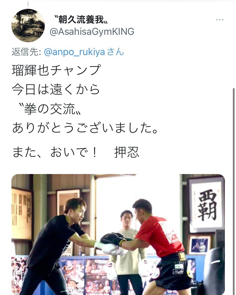 元K-1 WORLD GPスーパー・ライト級王者・安保瑠輝也(25=team ALL-WIN)が、昨日7日に自身のTwitterを更新し、朝久道場へ出稽古した様子を投稿した。