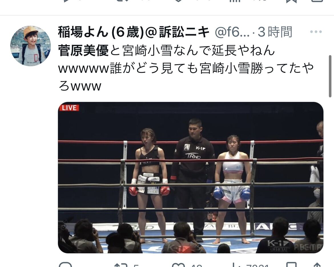 判定は3-0で宮﨑。女王決戦を制し、RISEに初勝利をもたらした。宮﨑は「今回プレッシャーとか不安とか負けたらどうしようって恐怖とかあったんですけど、ジムの皆さんと応援してくれる皆さんに支えられて勝つことができました。私は小学校6年の時に母を亡くしているんですが、日本一になれた姿を見せられたと思います。アトム級日本一を証明できたと思うので、もっと強くなれるように女子格闘技を盛り上げて行けるようになりたいです」と語った。https://news.yahoo.co.jp/articles/c502e252244b4989fb2335c4feda65659ba55e28