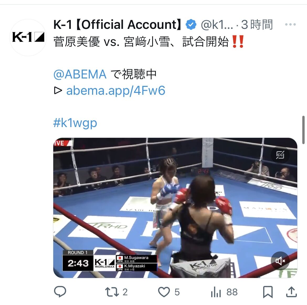 1R、サウスポーの宮﨑はジャブから左ハイ、菅原は右ミドルを蹴る。宮﨑はワンツーを打ち、クリンチになると菅原の顔を両手で押してコーナーへ。菅原は前蹴りで宮﨑を転倒させる。菅原が右ストレートを出すと宮﨑はその脇を潜るようにして右を打つ。