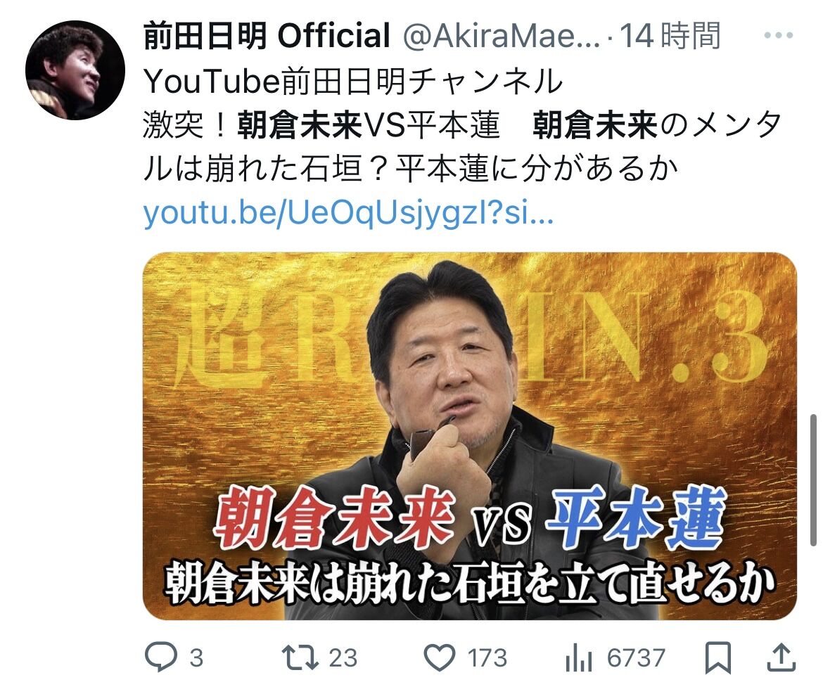 26日、未来のアウトサイダー時代の師匠でもある前田日明がYouTubeを投稿「朝倉未来のメンタルは崩れた石垣?平本蓮に分があるか」と題し、未来の現在の弱点、そして復活のアドバイスをメッセージした。
