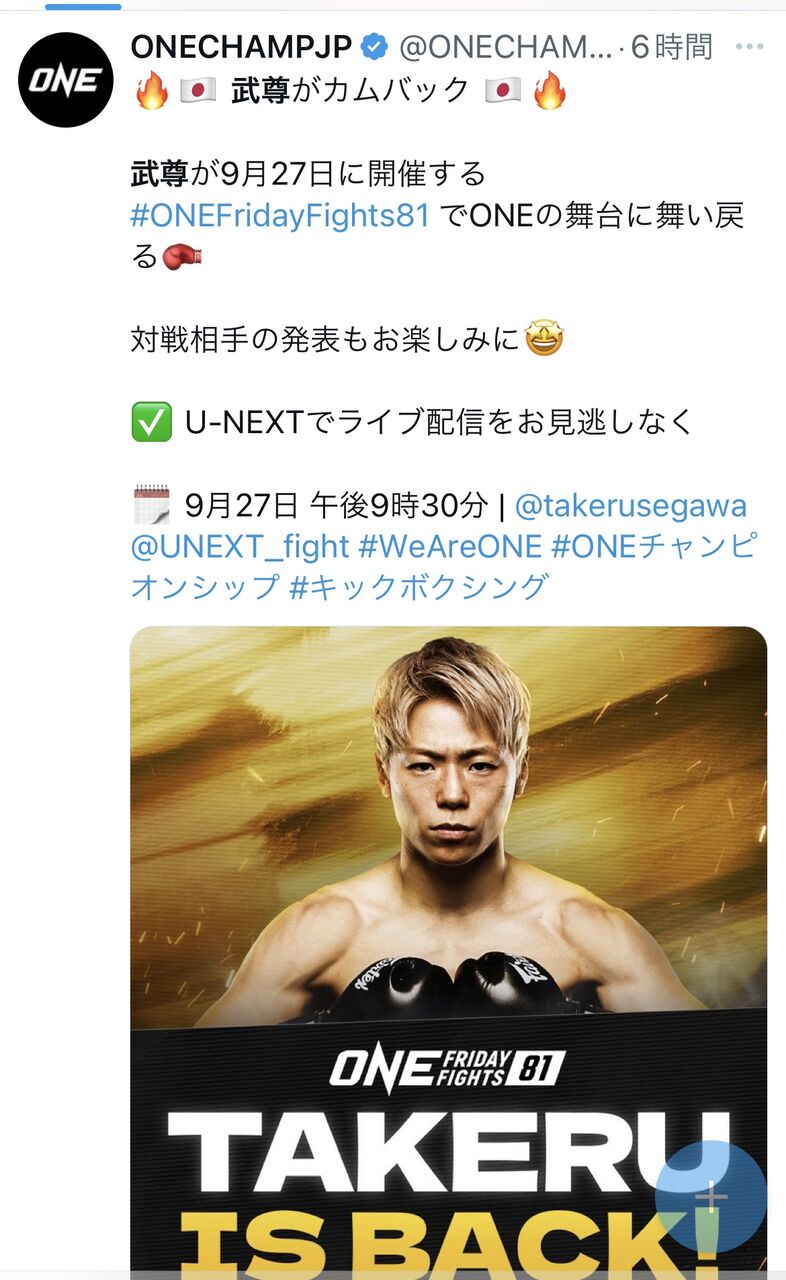 K-1 WORLD GP 3階級制覇王者の武尊(team VASILEUS)が「ONE Friday Fights 81」(9月27日、タイ・ルンピニースタジアム)で復帰戦を行うことが7月24日、ONEチャンピオンシップから発表された。