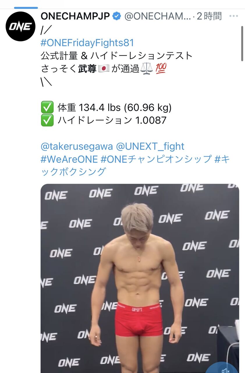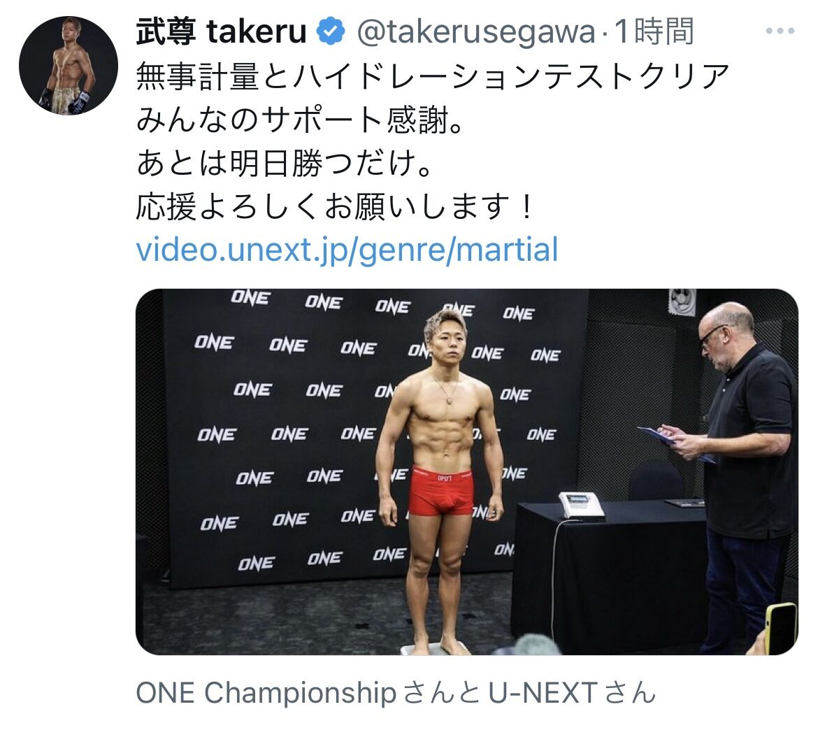 日本時間午後3時41分、武尊は自身のSNSに「無事計量とハイドレーションテストクリア。みんなのサポート感謝。あとは明日勝つだけ。応援よろしくお願いします!」と、計量の画像と共に投稿した。