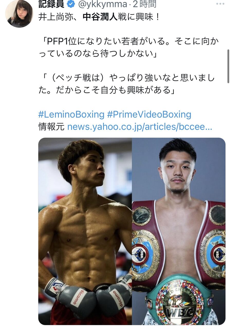 そして、自ら中谷について言及。中谷は米国の権威ある専門誌「ザ・リング」が定めるパウンド・フォー・パウンド(PFP=全階級を通じたランキング)1位を目標に掲げており、日本人で史上唯一ランクされた井上との対戦を意識している。現在PFP2位の井上は「パウンド・フォー・パウンド1位になりたいという若者がいるので、その若者が上がって来るのを待つしかないのかな。これだけボクシングファンが言っているのであれば、口に出してもいいのかな」と受けて立つ構えであることを明言したのだ。