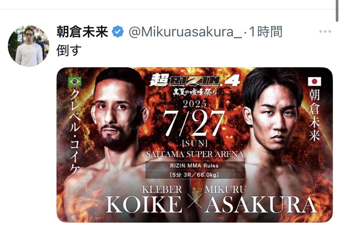 日本最大級の格闘技イベントRIZINは7日、東京・増上寺で記者会見を開催し「超RIZIN4真夏の喧嘩祭り」(7月27日、さいたまスーパーアリーナ)で朝倉未来(32=ジャパン・トップチーム)とクレベル・コイケ(35=ブラジル、ボンサイ柔術)が対戦すると発表した。