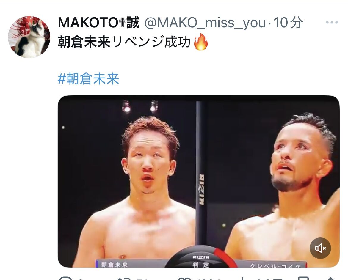 格闘技イベント「超RIZIN4 真夏の喧嘩祭り」(さいたまスーパーアリーナ)が27日に開催された。メインイベントでは朝倉未来(JTT)が、復帰2戦目で元フェザー級王者のクレベル・コイケ(ボンサイ柔術)に判定2ー1のスプリット判定勝利で4年越しのリベンジを果たした。復帰後2連勝を飾った。