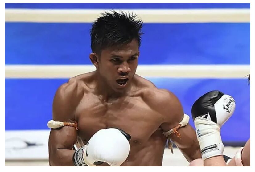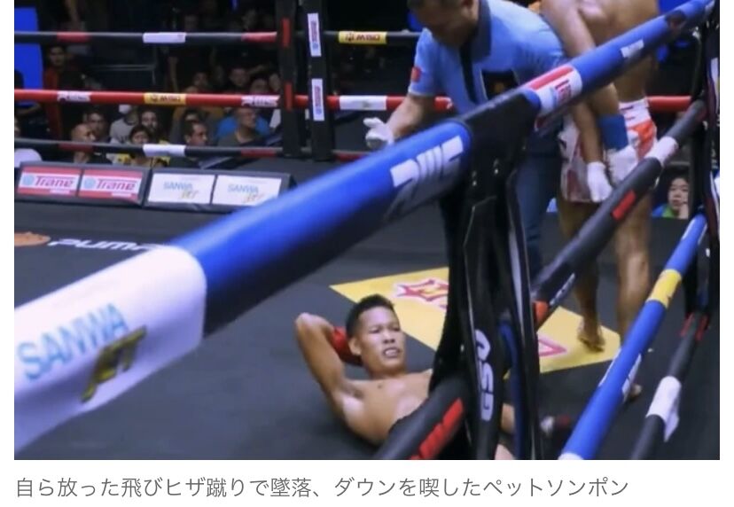 【ムエタイ】珍事!得意の飛びヒザ蹴りで高く飛びすぎ後頭部からマットに転落、起き上がれずダウンに